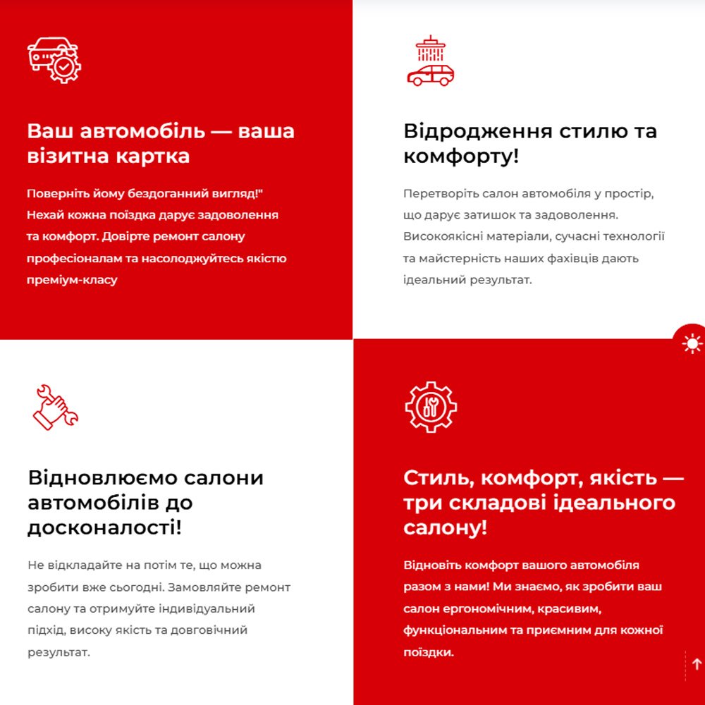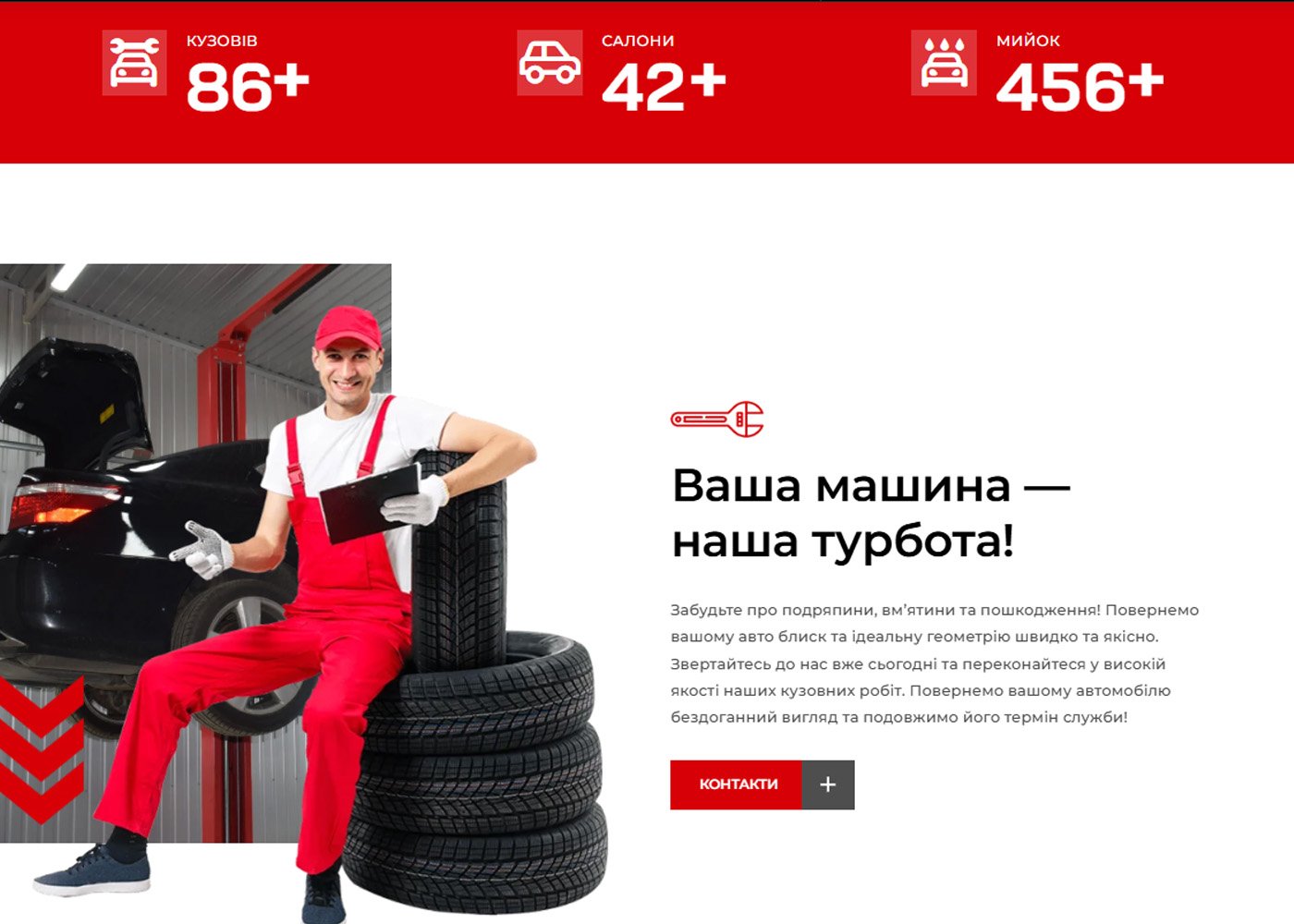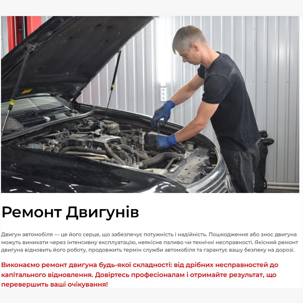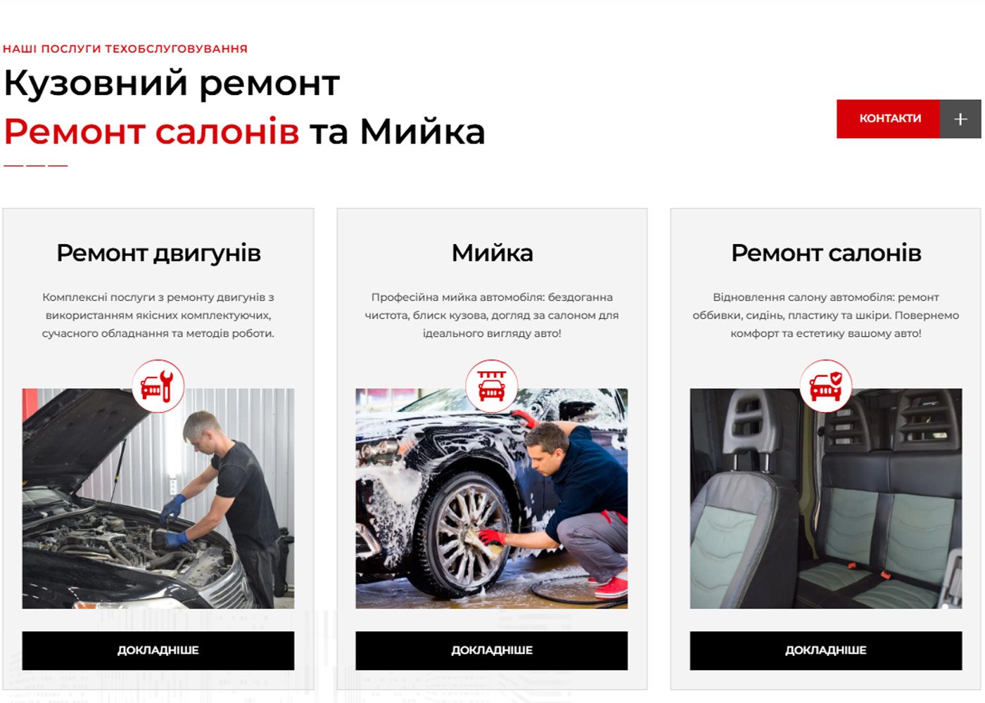 Створено сучасний корпоративний веб-ресурс із логічною навігацією, який включає наступні розділи: “Головна”, “Послуги”, серед яких окремо виділені та детально описані такі послуги, як “Ремонт кузовів”, “Ремонт салонів” та “Мийка”. Також присутні розділи “Магазин” з детальним каталогом продукції, “Публікації” з корисними статтями та “Контакти” для зворотного зв’язку. Сайт доступний українською мовою.