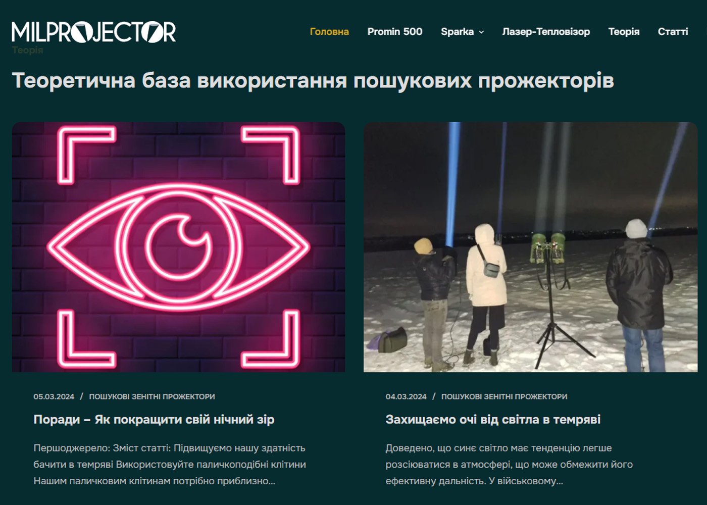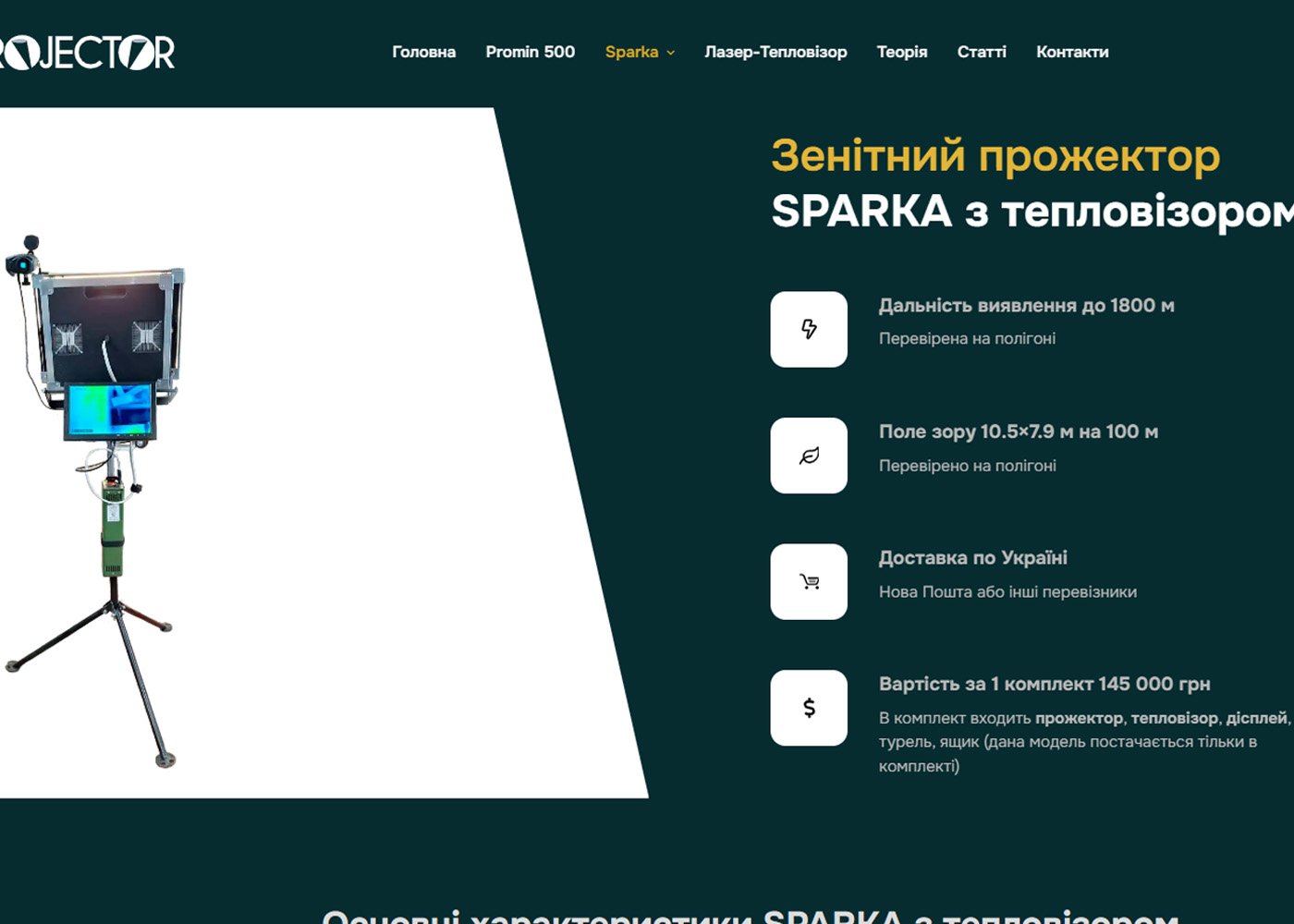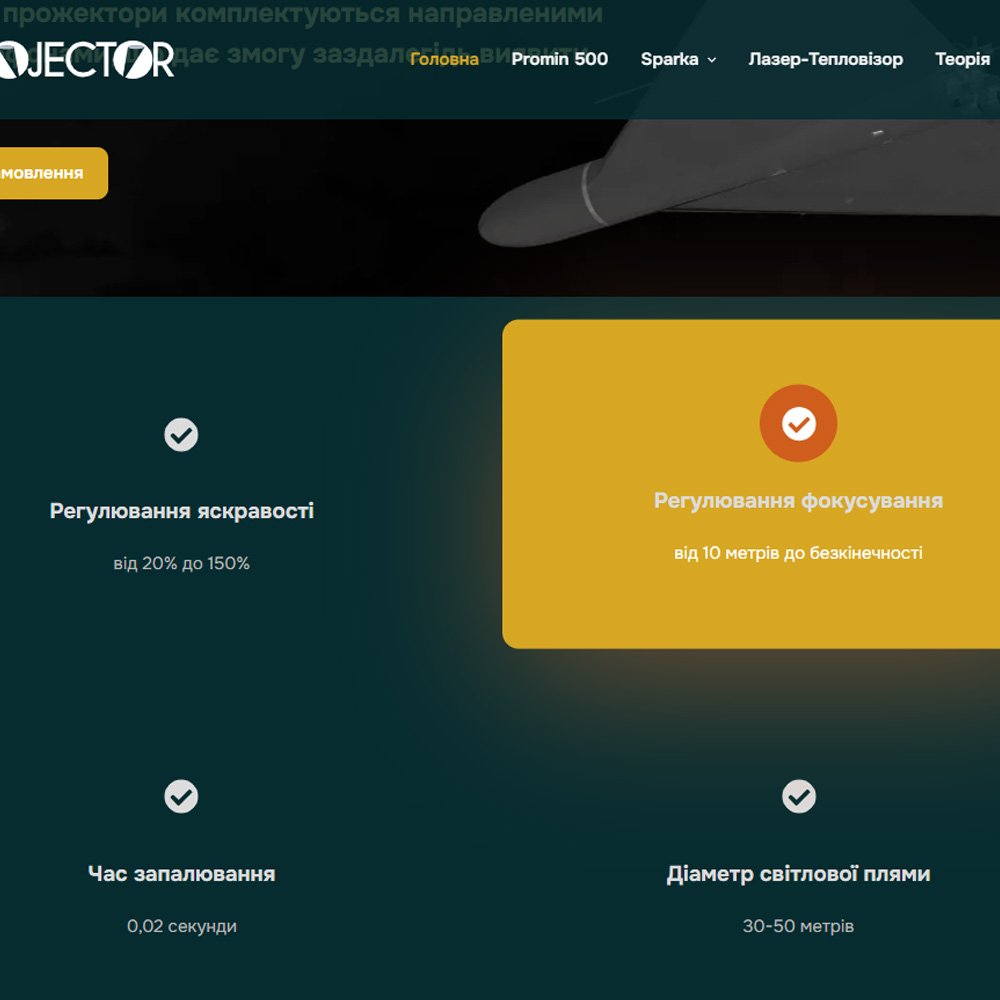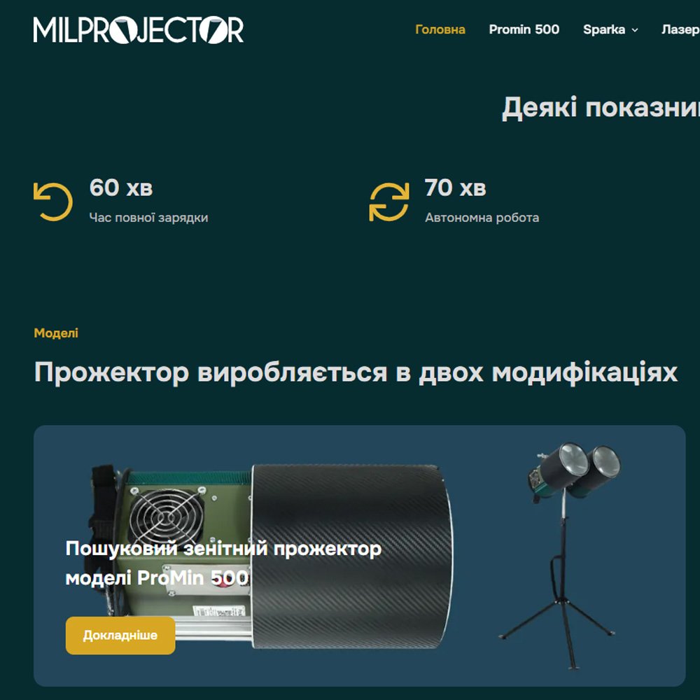 Корпоративний сайт реалізовано з урахуванням зручності користувачів – у ньому передбачено просту навігацію за основними розділами: “Головна”, “ProMin 500”, “Sparka”, “Лазер-Тепловізор”, “Теорія”, “Статті” та “Контакти”. На головній сторінці представлено інформацію про зенітні прожектори серії ProMin 500, їхні технічні характеристики та переваги. Розділ “ProMin 500” містить детальний опис продукту, включаючи дальність дії, час автономної роботи та інші ключові параметри. У розділі “Статті” публікуються інформаційні матеріали та новини, пов’язані з продукцією компанії та її застосуванням. Сайт також надає контактну інформацію та форму зворотного зв’язку для зручного спілкування з клієнтами.