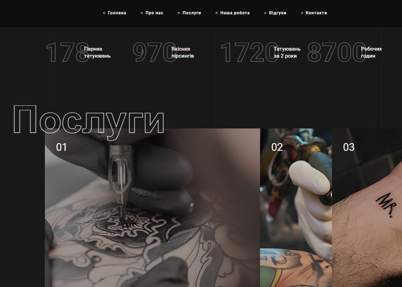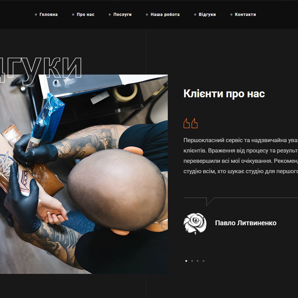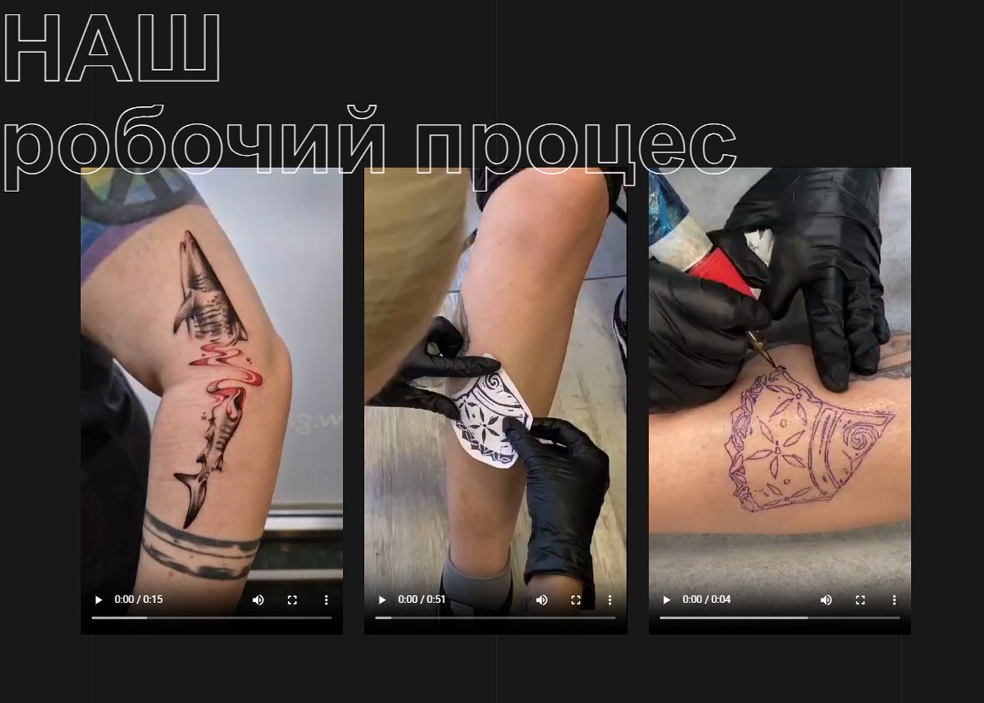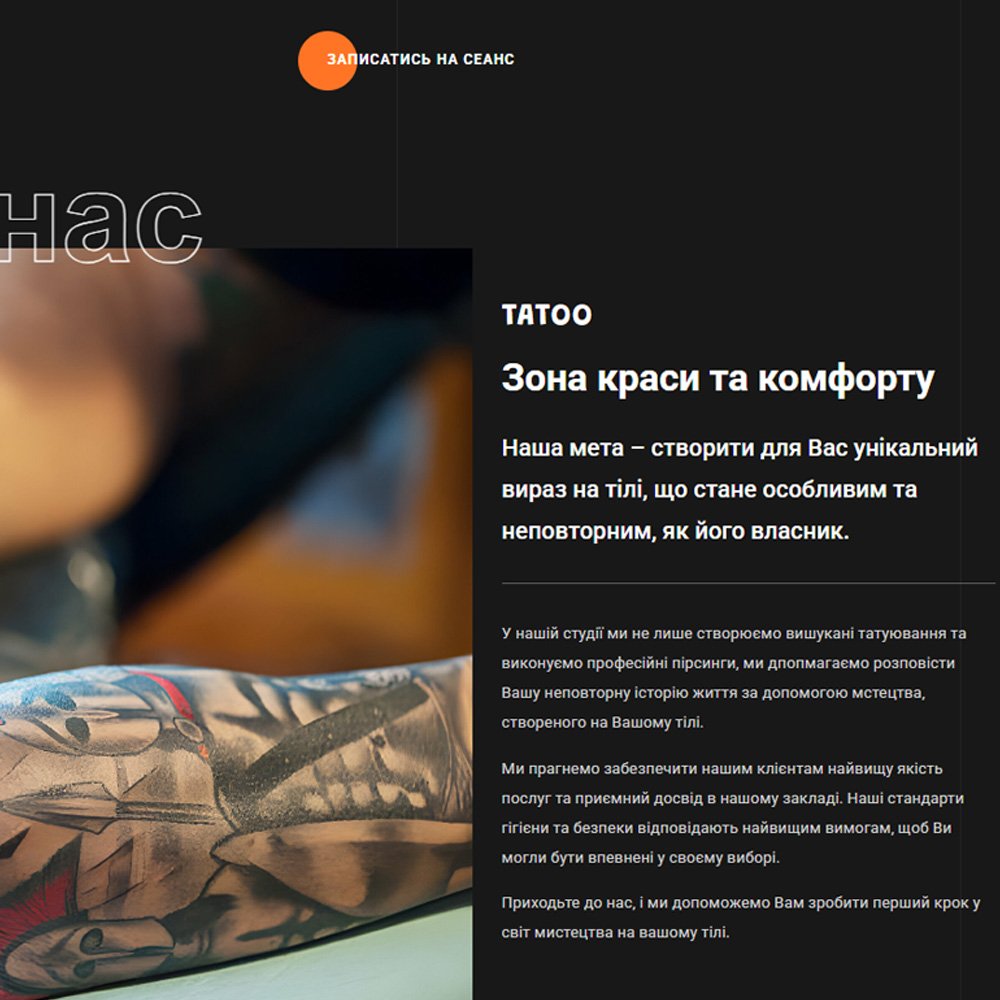 На сайті представлено тату-студію, яка спеціалізується на створенні індивідуальних татуювань та пірсингу для своїх клієнтів.